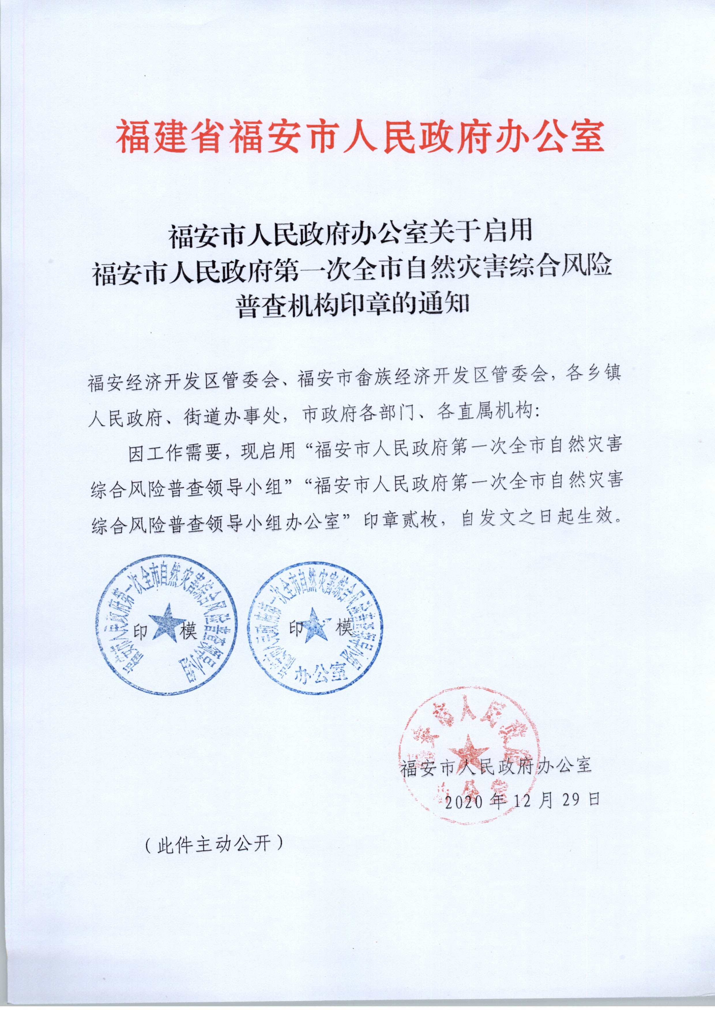 福安市beat365官网下载_怎么无限注册365游戏账号_365bet体育35元办公室关于启用福安市beat365官网下载_怎么无限注册365游戏账号_365bet体育35元第一次全市自然灾害综合风险普查机构印章的通知