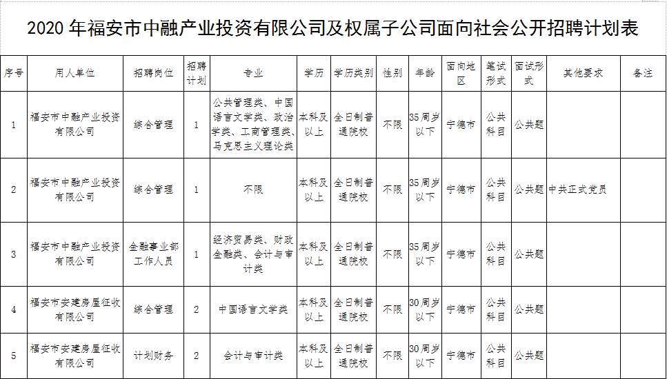 福安市中融产业投资有限公司于2018年6月经市政府批准由市财政出资组建的一家有限责任公司(国有独资),注册资本2亿元。因工作需要,根据福安市属国有(集团)公司用工管理办法(试行),经市财政局(安财国资〔2020〕3号)文件批复同意,面向社会公开招聘工作人员14名,现将考试工作有关事项公告如下: